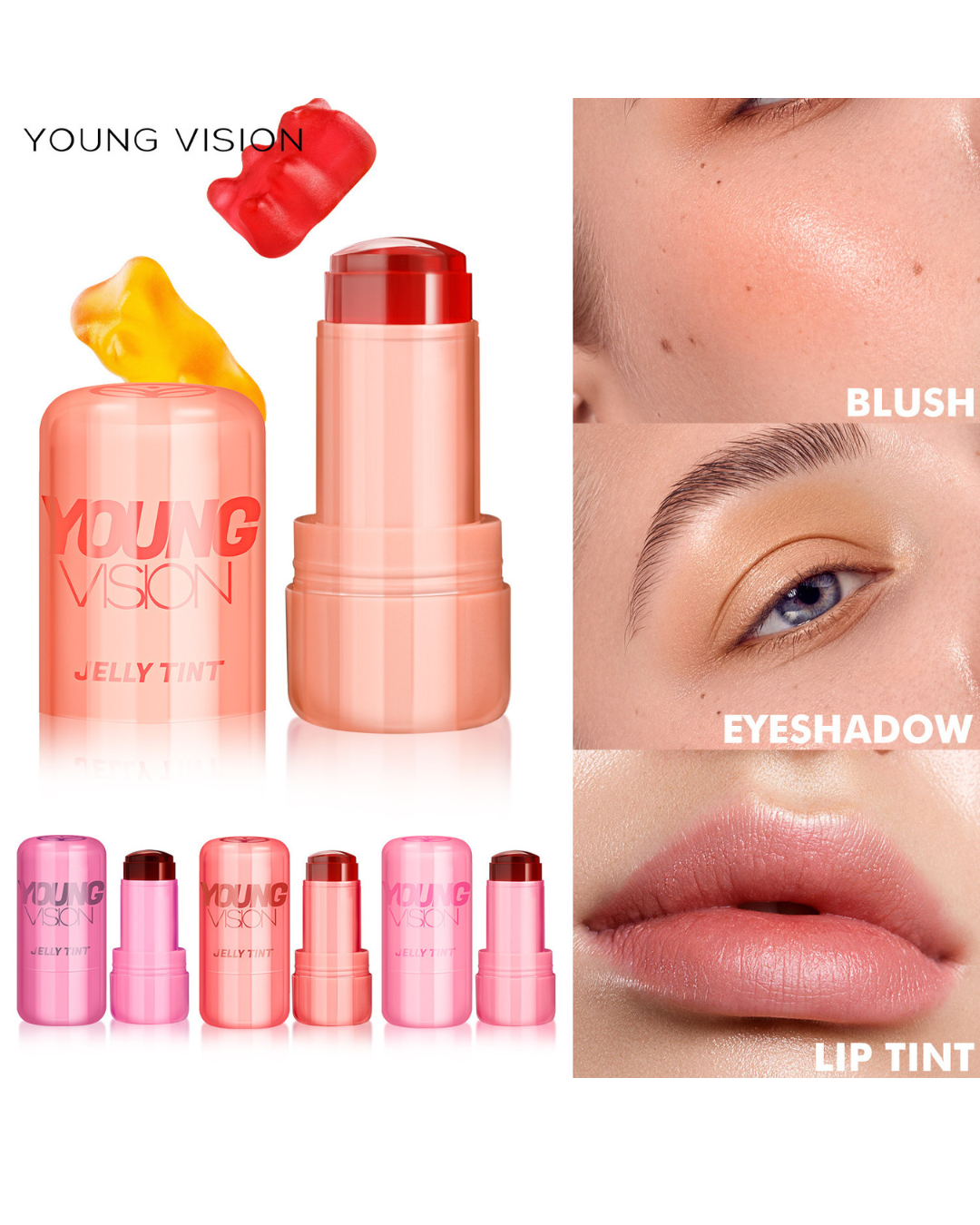 Young Vision Jelly Tint lip and cheek tint. Â Give your lips and cheeks a sheer, buildable watercolor effect. You can control the intensity of the color by applying more than one. Long-lasting, this tint is intensely pigmented and long-lasting, ensuring your color stays all day. It’s also waterproof, so you can enjoy staining without worrying about smudging or fading.